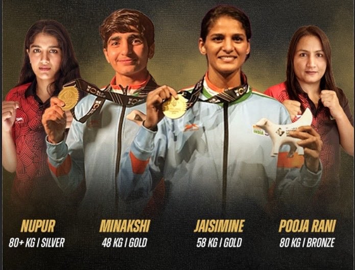From India, Meenakshi Hooda (48 kg) and Jaismine Lamboria (57 kg) were crowned world champions. India added two more medals. Nupur Sheoran (80+ kg) won silver and Pooja Rani (80 kg) bagged bronze in non-Olympic categories. While two-time world champion Nikhat Zareen crashed out in last eight.