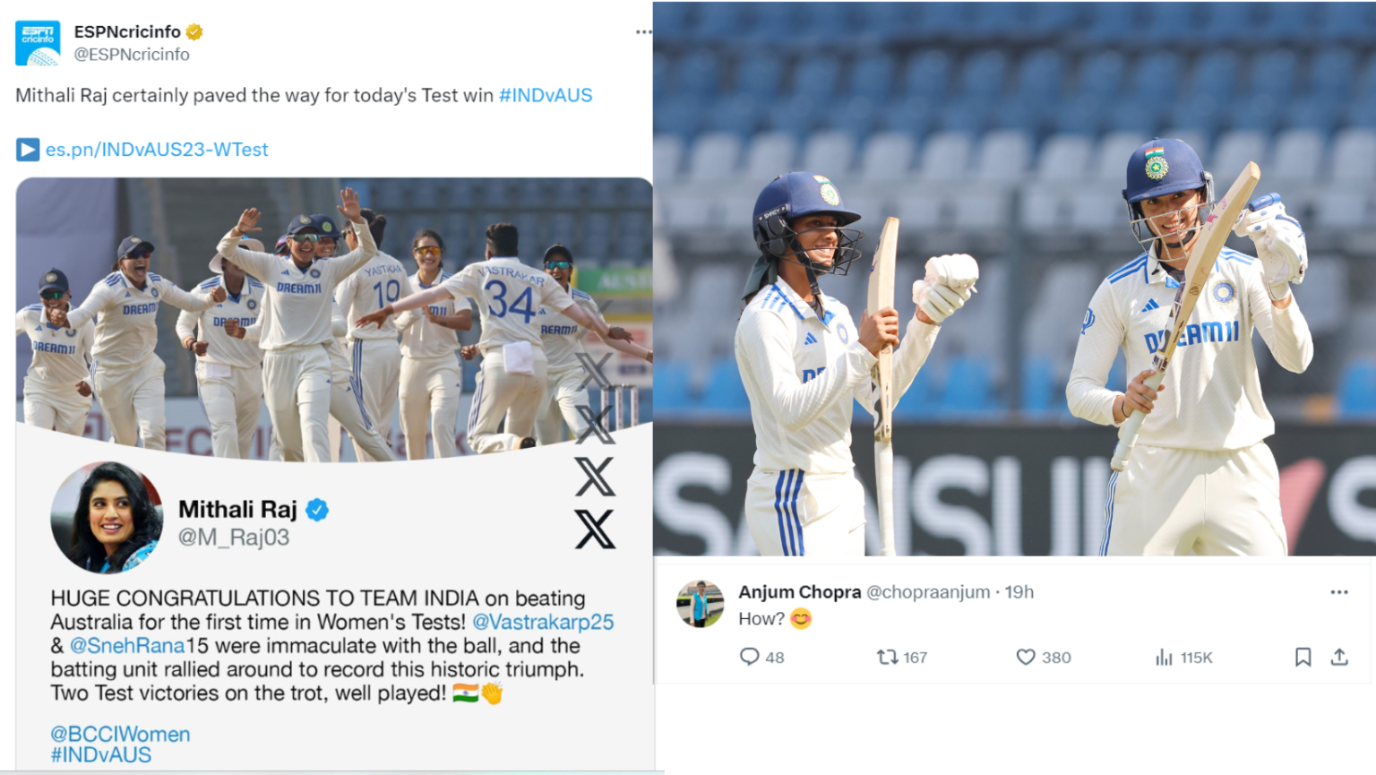 India’s women have just clinched a famous Test win against Australia. The sport has new-found momentum after back-to-back Test wins against England and Australia. Just when there were celebrations all round, toxicity seems to have cast a shadow on the win. An ESPN Cricinfo report credited Mithali Raj with having started the transformation. Yes, the headline could have been tweaked but it was clear to everyone what it was trying to portray. Mithali is a pioneer of the sport and some of the players like Sneh Rana, who won the player of the match award against Australia, were brought back into the team at her behest. The headline did not try to deny any of the current team members credit. And yet, soon after the report was tweeted, we saw Anjum Chopra, former captain and one of the most respected voices in the sport, post a cryptic response asking “How” – in what way was Mithali responsible for this win? She then clarified in a further tweet that her question was specifically meant for the headline.
