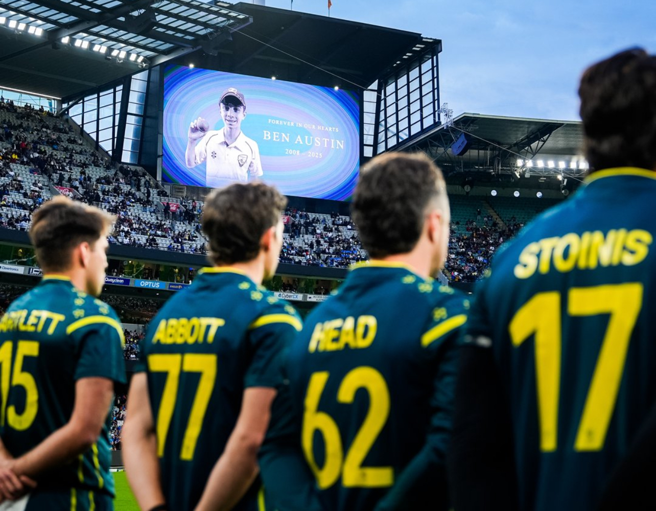 Ahead of the T20I at the MCG, both teams observed a moment of silence. Austin’s photo was displayed on the big screen, and his cap was placed on a plinth on the outfield. The match officials and players also wore black armbands in his memory.