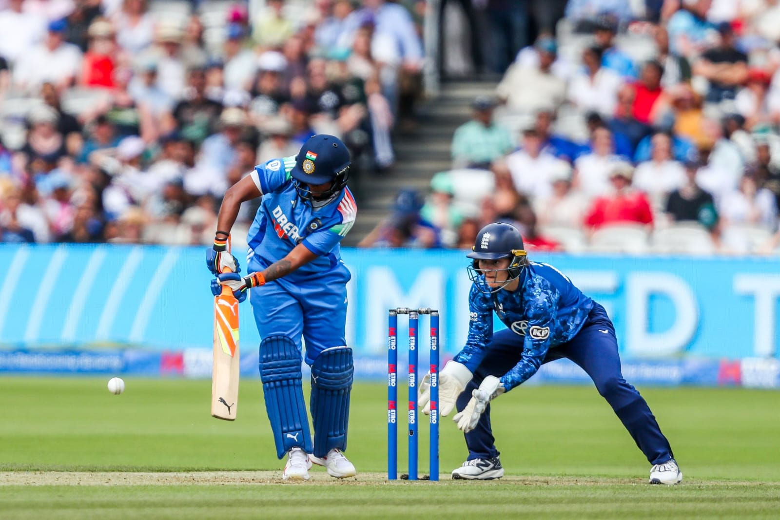 Coming in at number three, Harleen Deol partnered Smriti Mandhana, and the duo added a steady 40 runs for the second wicket. But Harleen’s resistance ended when Sophie Ecclestone dismissed her — Ecclestone’s first of three wickets in the innings.
