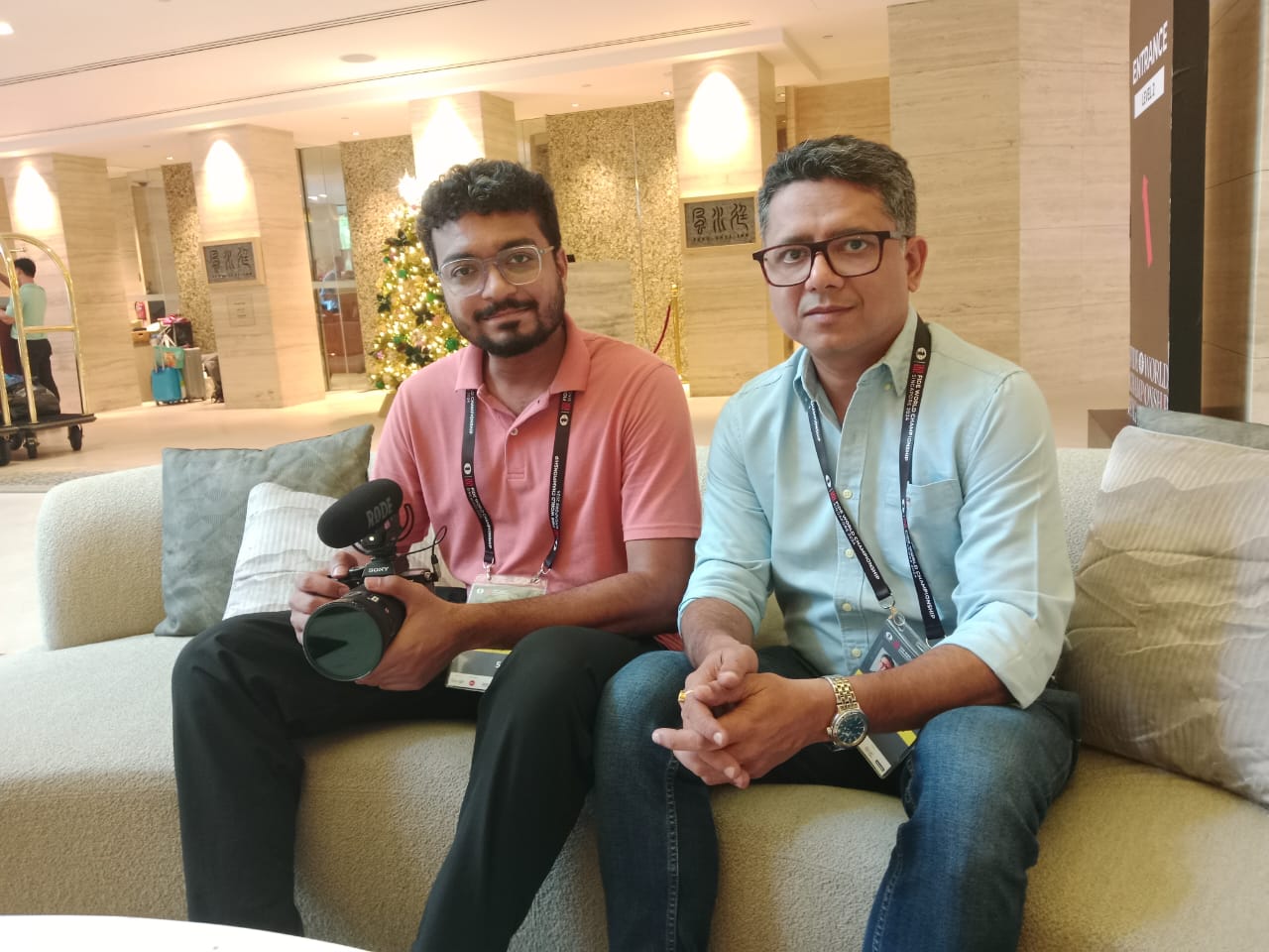 Abhineet Chute (left) and Prashant Raj of Dopamine Media at the World Chess Championship venue in Singapore