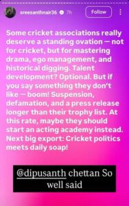 Sreesanth’s reaction did not stop at his media statement. In one of his Instagram stories, a sharp message was posted that read: “Some cricket associations really deserve a standing ovation – not for cricket, but for mastering drama, ego management, and historical digging. Talent development? Optional. But if you say something they don’t like – boom! Suspension, defamation, and a press release longer than their trophy list. At this rate, maybe they should start an acting academy instead. Next big export: Cricket politics meets daily soap.”