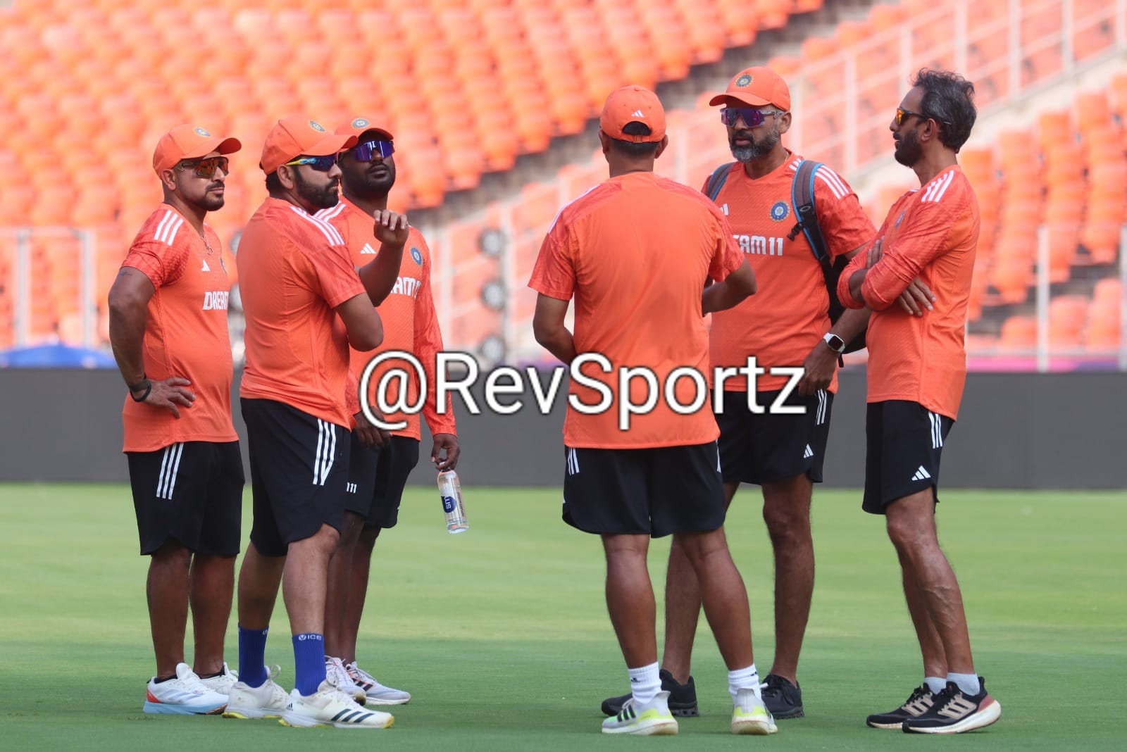 Post-pitch discussions and a friendly chat with Mohammed Kaif, Rohit Sharma padded up and spent 20 minutes at the nets. His training session concentrated on straight bat shots in the ‘V’ and extensive sweep practice, hinting at the potential role of spinners in Ahmedabad.