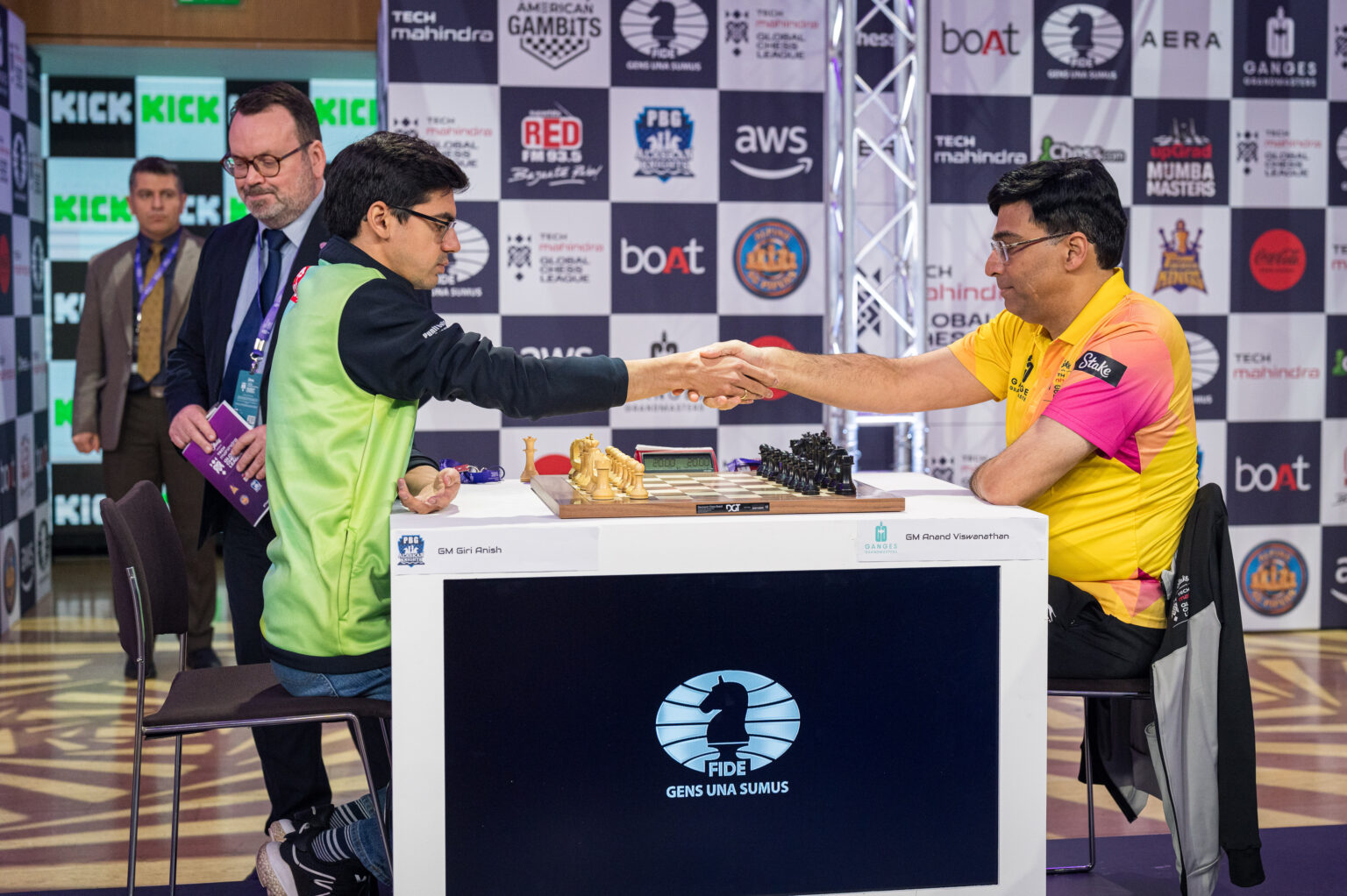 Viswanathan Anand of Ganges Grandmasters drew with Anish Giri of PBG Alaskan Knights in one of the top-board encounters . The five-time world champion from India could not penetrate the defence of the player who represents the Netherlands. The second-board game between Arjun Erigaisi and Nodirbek Abdusattarov was drawn as well.