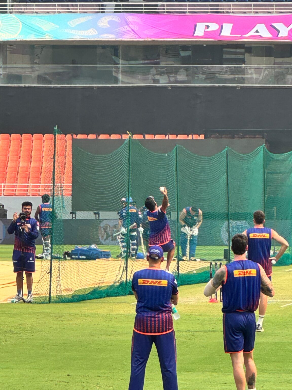 Soon after, he got into his bowling groove. Both Bumrah and Trent Boult began their bowling drills around the same time, taking turns on the centre wicket. With Rajangad Bawa, Jonny Bairstow, and a few other batters rotating through the nets, Bumrah and Boult together bowled more than 10 overs. Bumrah, in particular, kept going for almost 40 minutes, working hard under the scorching sun. While other big names from the franchise — Rohit Sharma and Hardik Pandya batted in the private nets.