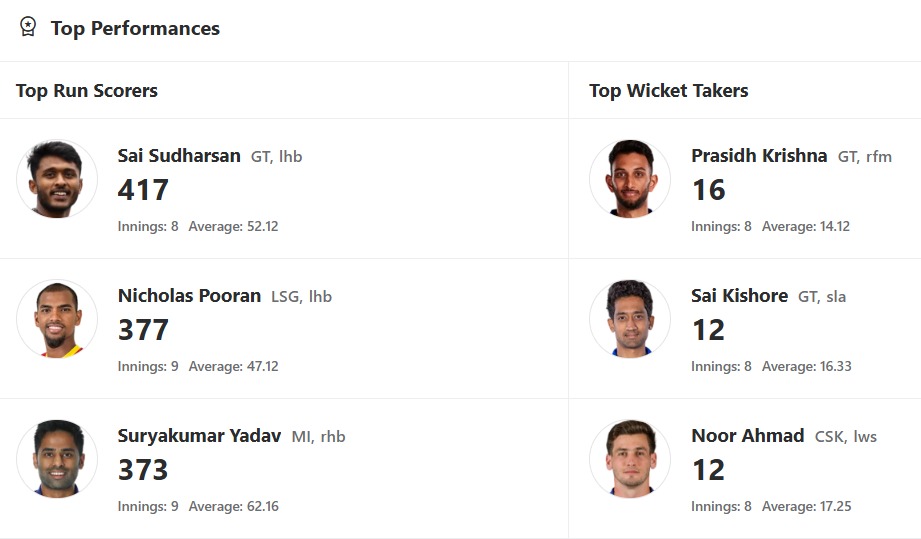 GT’s Sai Sudharsan, with 417 runs, is the Orange Cap holder as of now. His consistency has been commendable this season. LSG’s Nicholas Pooran is in the second spot with 377 runs. MI’s Suryakumar Yadav regains the third spot with 373 runs. GT’s Jos Buttler is next at Number four with 356 runs, followed by LSG’s Mitchell Marsh with 344 runs.