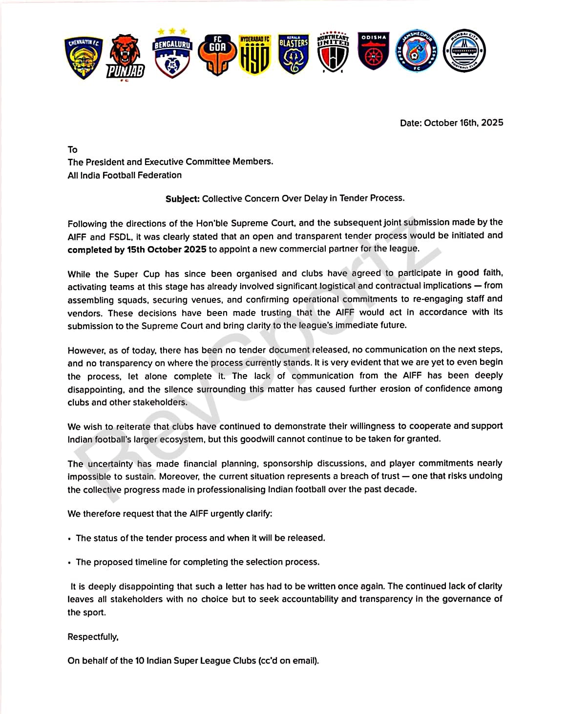 Ten ISL clubs have jointly written to the AIFF expressing concern over the delay in launching the new commercial tender.