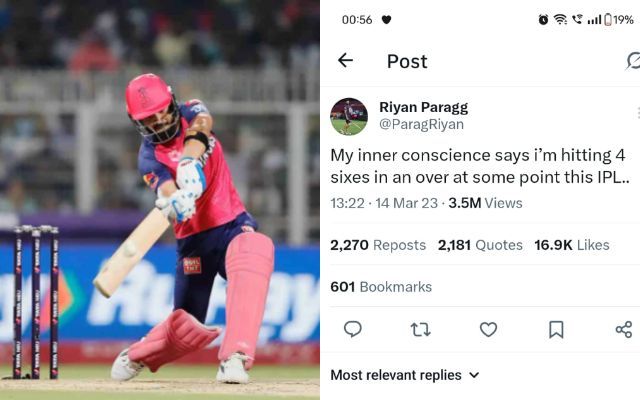 It was the 13th over of RR’s innings, and then, in the next over, when he came up against Varun Chakravarthy, he smashed another six, and eventually, he smashed six consecutive sixes on six deliveries. After such heroics, Parag’s old tweet went viral, which he posted on 14 March 2023. It was written: “My inner conscience says I’m hitting 4 sixes in an over at some point this IPL..”
