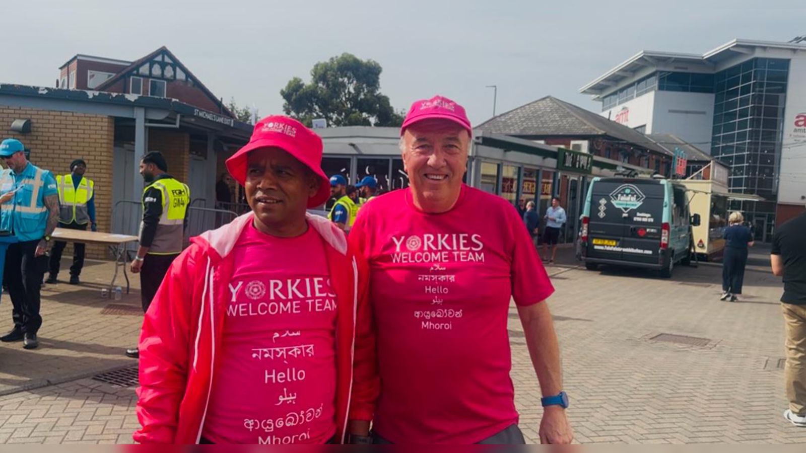 At the entrance to the media box, I was directed by a couple of helpful young men in the Yorkie tees — clearly Indian volunteers. Both were extremely kind, directing me to the coffee area and helping me find the water fountain on the other side. We got talking and exchanged numbers. They were Vatsal Modi from Surat and Tarun Kumar (names used with consent) from Pathankot — students at Leeds Becket University.