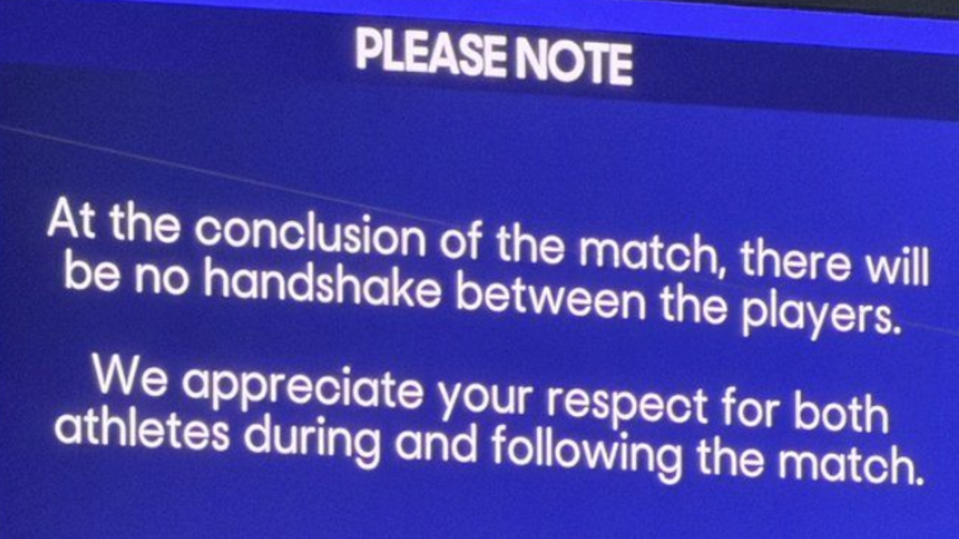 At the Australian Open, ahead of the semi-final clash between Aryna Sabalenka of Belarus and Elina Svitolina of Ukraine, a message flashed on the stadium screens: “At the conclusion of the match, there will be no handshake between the players. We appreciate your respect for both athletes during and following the match.”