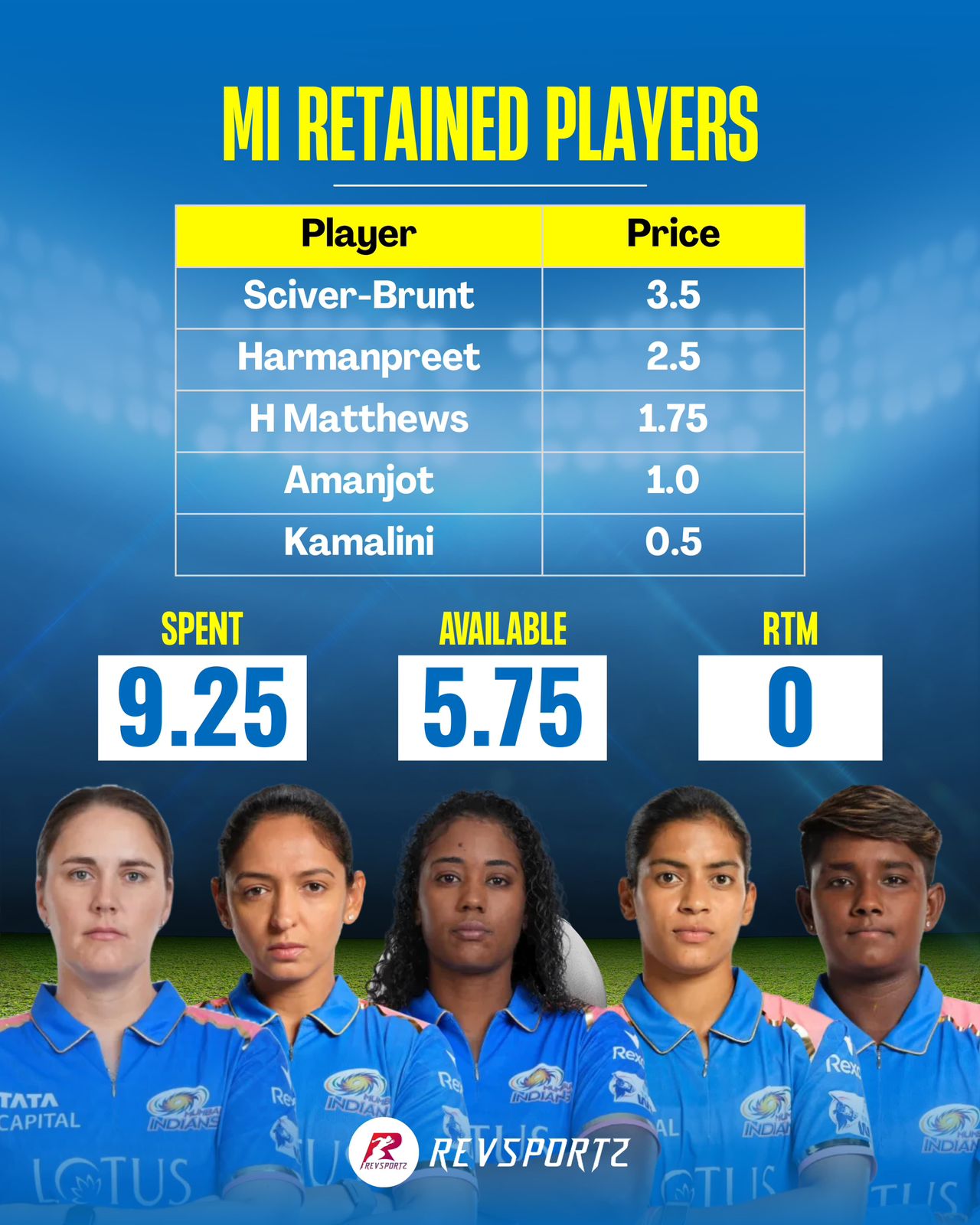 The defending champions Mumbai Indians have announced their retentions ahead of the upcoming WPL season, holding on to five players, Nat Sciver-Brunt (₹3.5 crore), Harmanpreet Kaur (₹2.5 crore), Hayley Matthews (₹1.75 crore), Amanjot Kaur (₹1 crore), and young wicketkeeper G. Kamalini. The total spend stands at ₹9.25 crore, leaving them with a healthy purse of ₹5.75 crore going into the auction.