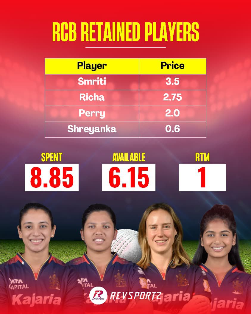 Royal Challengers Bengaluru (RCB) have gone with a mix of certainty, marketability, and long-term investment in their WPL retentions, naming four players, Smriti Mandhana (₹3.5 crore), Richa Ghosh (₹2.75 crore), Ellyse Perry (₹2 crore), and Shreyanka Patil (₹60 lakh). The decisions, though largely expected, reveal a clear pattern in how RCB view their squad: built around leadership, stability, and star value.